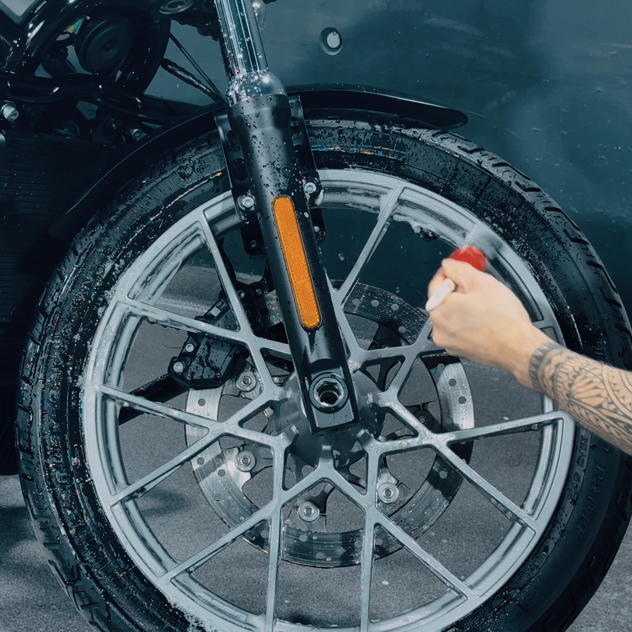 - Lassen Sie das Produkt 1-2 Minuten einwirken. Verwenden Sie eine weiche Felgenbürste, um den Reiniger zu verteilen, sowie Schmutz und Bremsstaub zu lösen. Der SWISSVAX Wheel Spray Forte Reiniger verfärbt sich Lila und zeigt damit seinen Reinigungseffekt.