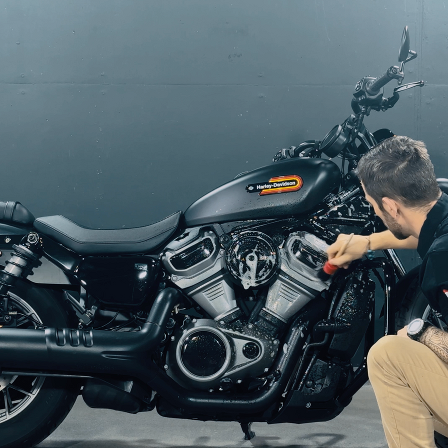 - Sprühen Sie SWISSVAX Supreme Motorcycle Cleaner auf die kalte, trockene Oberfläche, verteilen Sie den Reiniger mit einem Pinsel und lassen Sie es 1-2 Minuten einwirken.