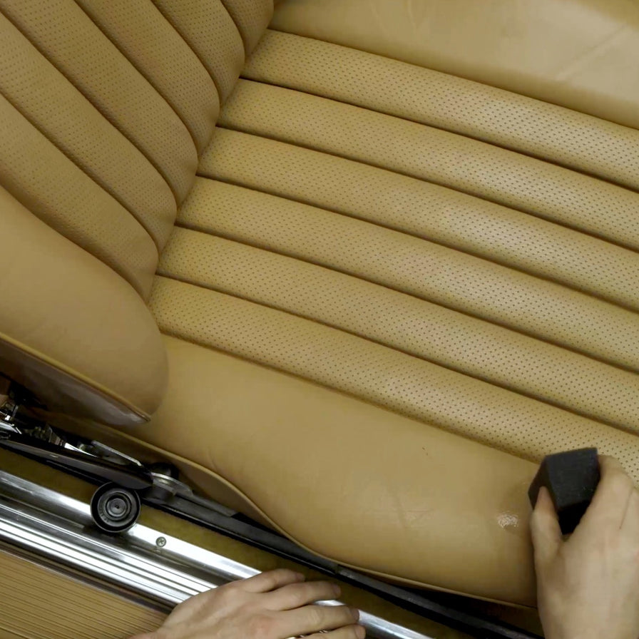 The hardening can be partially reversed, but a shrunken leather remains shrunken. This is particularly bad news for dashboards that are difficult to remove. However, such shrunken leathers should still be treated with Leather Softener to protect the leather from degradation and make it more resistant. Hardened leather is moistened as much as possible with Leather Softener. For leather with a very smooth and closed surface, treat it first with our leather sanding pad to achieve better absorption of the softener. The softener is a purely synthetic oil and does not degrade like animal oils, which oxidize after a short time.